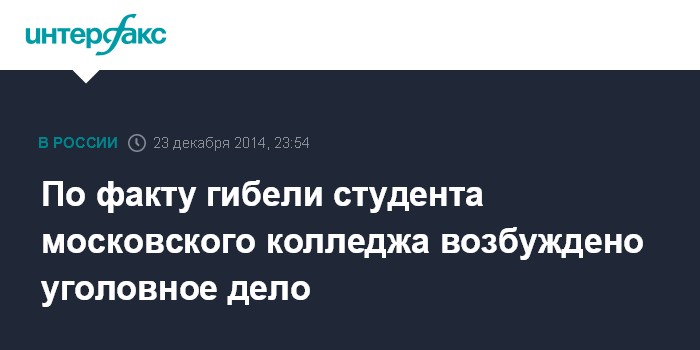 Москва. 23 декабря. INTERFAX.RU - Московские следователи возбудили уголовное дело о непредумышленном убийстве ученика колледжа на севере Москвы. Об этом "Интерфаксу" сообщила представитель столичного главка СКР Юлия Иванова.
