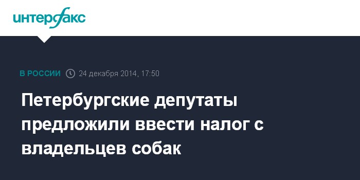 Москва. 24 декабря. INTERFAX.RU - Депутаты Заксобрания Санкт-Петербурга предлагают взимать налог с хозяев собак в сумме 1 тыс рублей в год за особь. Соответствующая инициатива размещена в среду в базе законодательной деятельности Госдумы.