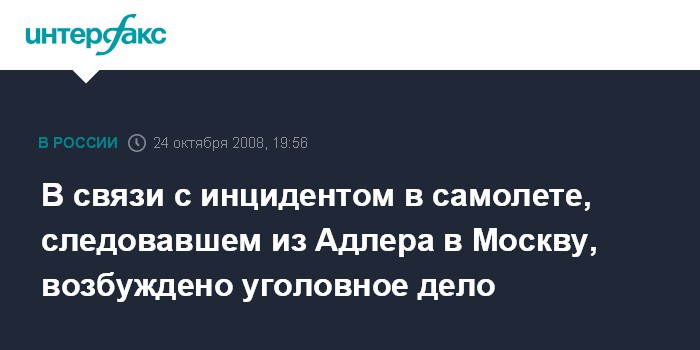 Москва. 24 октября. INTERFAX.RU - По факту инцидента в самолете, следовавшем рейсом Адлер-Москва, Следственный комитет при прокуратуре (СКП) РФ возбудил уголовное дело по статье "угон воздушного судна".