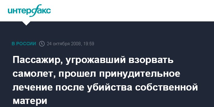 Москва. 24 октября. INTERFAX.RU - Пассажир, угрожавший в пятницу взорвать самолет Адлер-Москва, только что освободился от принудительного лечения после того, как убил собственную мать, сообщили "Интерфаксу" в Центре общественных связей ФСБ России.