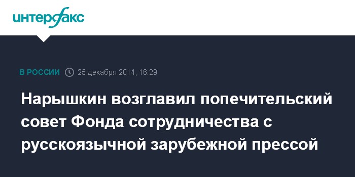 Москва. 25 декабря. INTERFAX.RU - Председатель Госдумы Сергей Нарышкин назначен главой попечительского совета Фонда сотрудничества с русскоязычной зарубежной прессой, который создан при Всемирной ассоциации русской прессы (ВАРП).