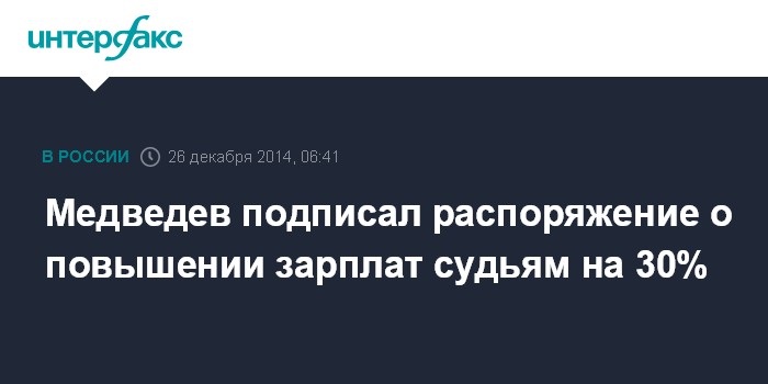 Москва. 26 декабря. INTERFAX.RU - Премьер-министр Дмитрий Медведев подписал распоряжение о повышении зарплаты судей на 30% с 2014 по 2016 годы, сообщает в пятницу сайт правительства.