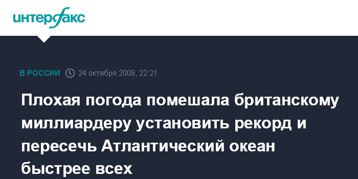 Нью-Йорк. 24 октября. ИНТЕРФАКС - Неблагоприятные погодные условия заставили британского миллиардера Ричарда Брэнсона отказаться от попытки пересечь Атлантический океан на яхте за рекордное время, сообщает в пятницу американский телеканал Си-Эн-Эн.