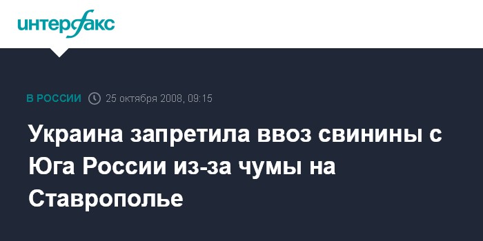Распоряжением Главного государственного инспектора ветеринарной медицины Украины с 24 октября запрещен ввоз в страну из Ставропольского края, Ростовской области, Калмыкии, Дагестана, Северной Осетии, КЧР, Краснодарского края, Адыгеи и Чечни восприимчивых к африканской чуме свиней (АЧС) животных, продуктов и сырья из них.