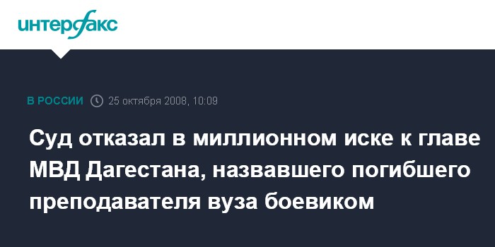 Москва. 25 октября. INTERFAX.RU - Суд Советского района Махачкалы вынес постановление об отказе в иске в 1 млн рублей, предъявленному министру внутренних дел Дагестана Адильгерею Магомедтагирову.