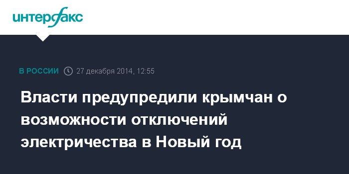 Москва. 27 декабря. INTERFAX.RU - Жители Крыма могут столкнуться с отключениями электроэнергии в новогоднюю ночь, но они не будут длительными, заявил глава региона Сергей Аксенов.
