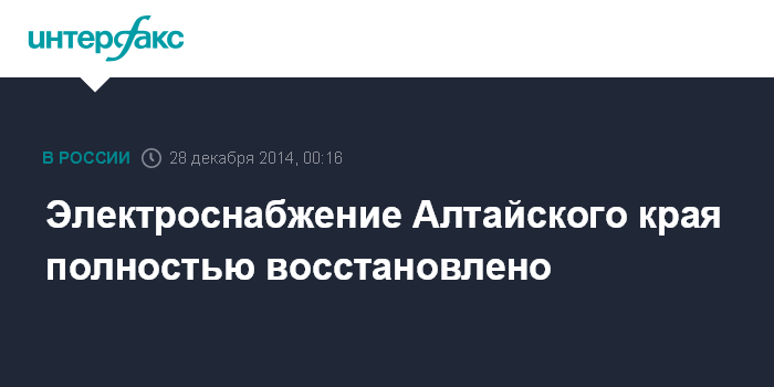 Москва. 28 декабря. INTERFAX.RU - Электроснабжение населенных пунктов Алтайского края, нарушенное непогодой, восстановлено, сообщает Сибирский региональный центр МЧС России.