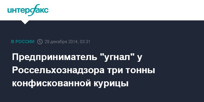 Москва. 29 декабря. INTERFAX.RU - Сахалинский предприниматель организовал угон грузовика с курятиной, изъятой у него Россельхознадзором и отправленной на утилизацию из-за несоответствия качеству. Об этом сообщает пресс-служба управления ведомства по Приморскому краю и Сахалинской области.