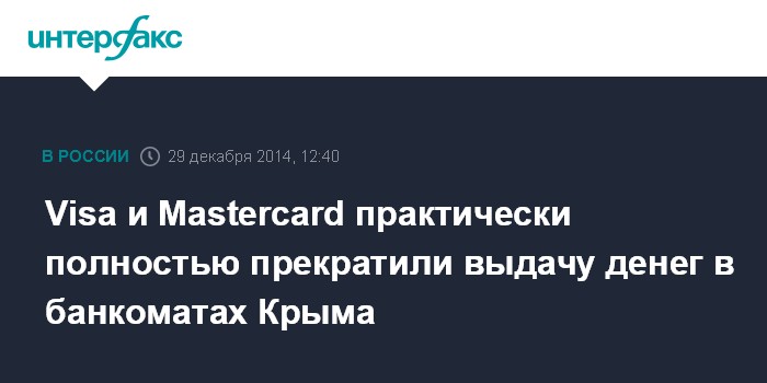 Москва. 29 декабря. INTERFAX.RU - Обслуживание карт международных платежных систем Visa и Mastercard в Крыму практически прекращено, снять деньги в банкоматах могут только владельцы карт банка, которому принадлежит банкомат.