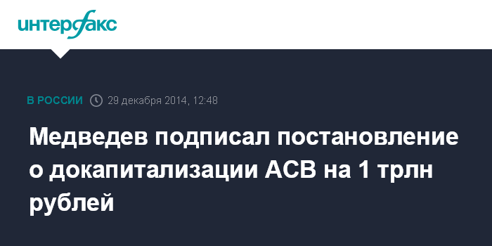 Москва. 29 декабря. INTERFAX.RU - Премьер РФ Дмитрий Медведев подписал документ о докапитализации госкорпорации "Агентство по страхованию вкладов" путем передачи ей облигаций федерального займа на сумму 1 трлн рублей.