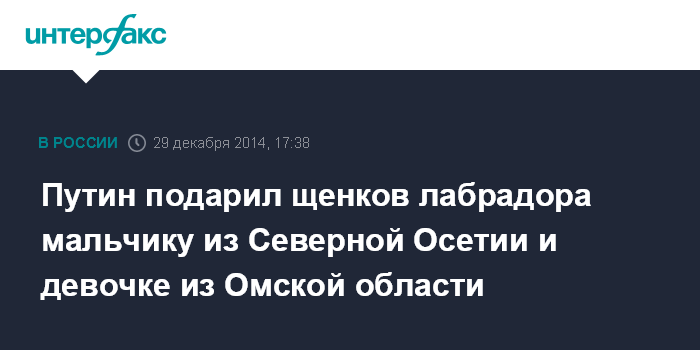 Москва. 29 декабря. INTERFAX.RU - Президент России Владимир Путин накануне Нового года подарил щенков лабрадора двум маленьким россиянам, которые попросили главу государства о подарке.
