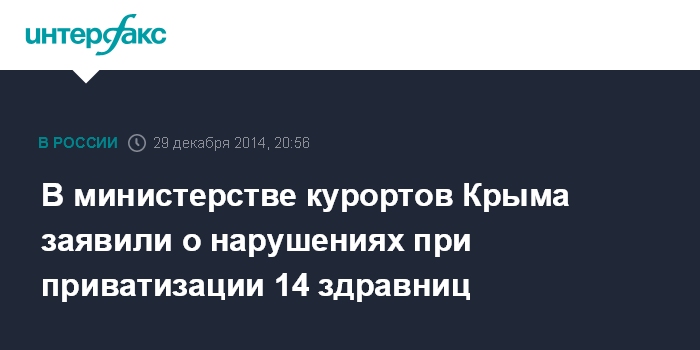 Москва. 29 декабря. INTERFAX.RU - Министерство курортов Крыма выявило нарушения при приватизации 14 санаториев и пансионатов в период, когда полуостров находился в составе Украины, эти объекты могут быть возвращены в госсобственность, сообщил в понедельник журналистам заместитель министра курортов и туризма Крыма Игорь Котляр.