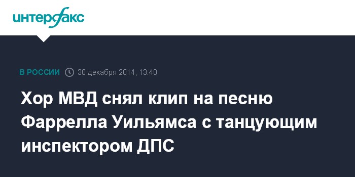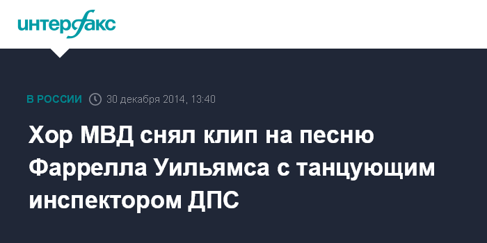 Москва. 30 декабря. INTERFAX.RU - Московская полиция сняла клип на песню Фаррелла Уильямса "Хэппи", в котором сотрудник ДПС, увидев, что ему звонит его девушка, начинает танцевать на своем посту. Ролик к Новому году был опубликован на сайте ГУ МВД России по г. Москве.