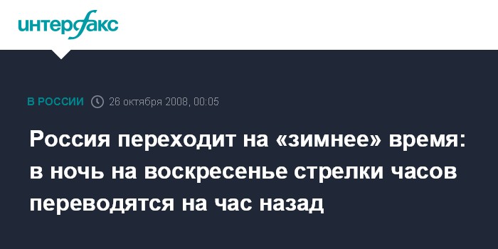 В связи с этим стрелки часов на всей территории РФ в 3 часа ночи 26 октября 2008 года (по местному времени) переводятся на один час назад.