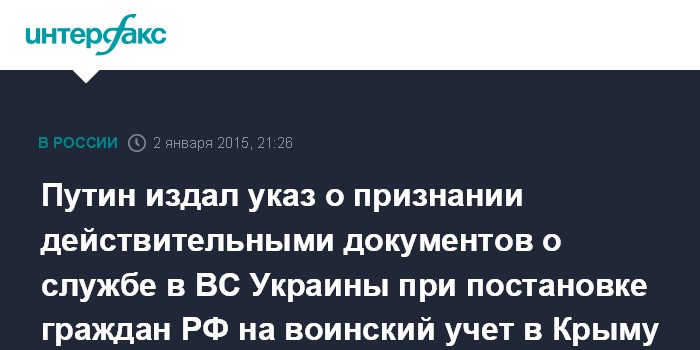 Москва. 2 января. INTERFAX.RU - Президент РФ Владимир Путин издал указ о признании действительными документов о прохождении военной службы в Вооруженных силах Украины при постановке граждан России на воинский учет в Крыму и Севастополе.