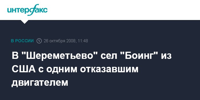 Москва. 26 октября. INTERFAX.RU - На подлете к "Шереметьево" у Боинга-767 американской авиакомпании "Дельта Атлант" отказал один двигатель. Тем не менее, самолет благополучно сел, сообщили "Интерфаксу" источники в министерстве по чрезвычайным ситуациям.