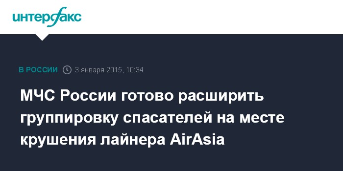 Москва. 3 января. INTERFAX.RU - МЧС России готово при необходимости усилить группировку спасателей, задействованную в работах по поиску разбившегося у берегов Индонезии самолета авиакомпании AirAsia.