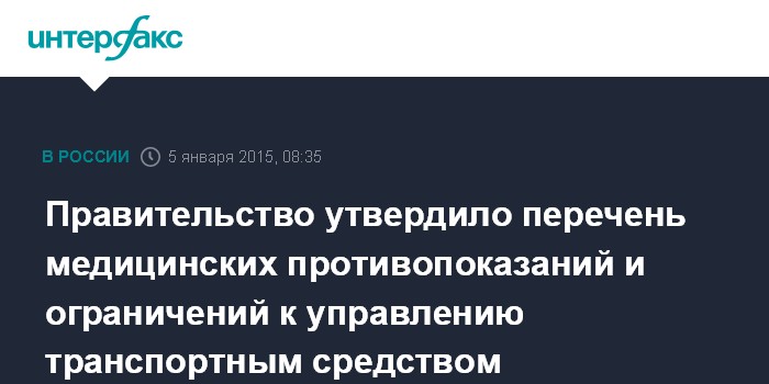 Подписанным постановлением утверждены: перечень медицинских противопоказаний к управлению транспортным средством; перечень медицинских показаний к управлению транспортным средством; перечень медицинских ограничений к управлению транспортным средством.