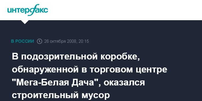 Москва. 26 октября. ИНТЕРФАКС-МОСКВА - Подозрительный предмет, из-за обнаружения которого пришлось эвакуировать посетителей торгового комплекса "Мега-Белая Дача", оказался коробкой с мусором, сообщил "Интерфаксу" в воскресенье вечером источник в правоохранительных органах.
