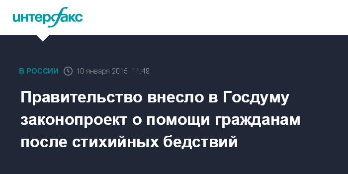 Москва. 10 января. INTERFAX.RU - Премьер-министр РФ Дмитрий Медведев внес в Госдуму законопроект, позволяющий построить эффективную многоуровневую систему оказания помощи гражданам на восстановление имущества, утраченного в результате чрезвычайных ситуаций, сообщает в субботу сайт правительства РФ.