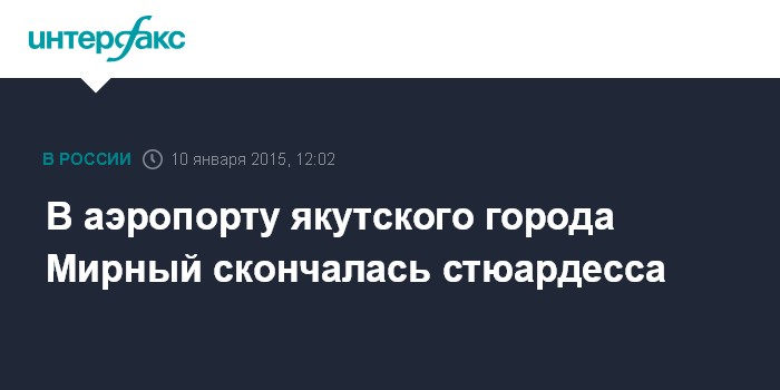 Москва. 10 января. INTERFAX.RU - Стюардесса скончалась в аэропорту города Мирный, сообщил "Интерфаксу" в субботу источник в службах аэропорта.