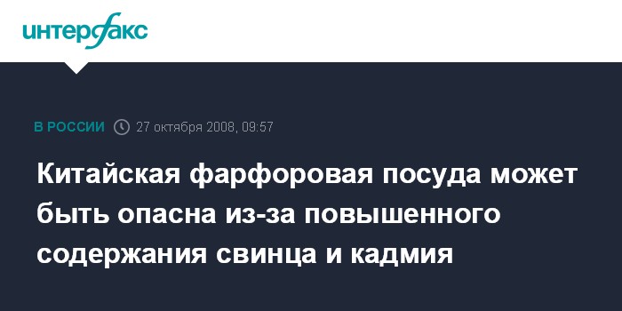 Москва. 27 октября. INTERFAX.RU - Китайское общество контроля над качеством "Ваньлисин" распространило уведомление, в котором предлагает покупателям фарфоровой или же керамической посуды обращать внимание на то, что в глазури или же краске такой посуды может содержаться повышенное содержание свинца и кадмия.