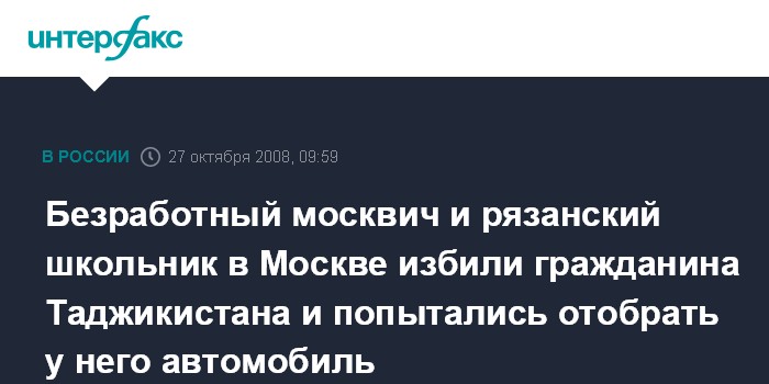 Москва. 27 октября. INTERFAX.RU - В Москве за нападение на гражданина Таджикистана задержаны неработающий москвич и ученик 11 класса, проживающий в Рязани, сообщил "Интерфаксу" источник в правоохранительных органах города в понедельник.