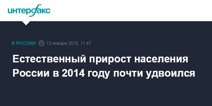 Москва. 13 января. INTERFAX.RU - Естественный прирост населения РФ, по последним оценкам Минтруда России, за январь-ноябрь 2014 года почти вдвое превысил показатель аналогичного периода 2013 года, сообщил глава министерства Максим Топилин.