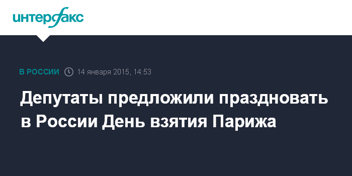 Москва. 14 января. INTERFAX.RU - В Госдуму внесен законопроект об установлении в России нового Дня воинской славы - Дня взятия Парижа и победоносного завершения Отечественной войны 1812 года и заграничных походов Русской армии 1813-1814 годов.