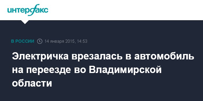 Москва. 14 января. INTERFAX.RU - Столкновение легкового автомобиля и пригородного электропоезда произошло в среду во Владимирской области, сообщила "Интерфаксу" специалист пресс-службы Северной железной дороги (СЖД) Любовь Соловьева.