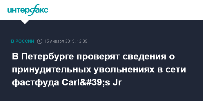 Москва. 15 января. INTERFAX.RU - Прокуратура Петербурга проводит проверку информации о возможных нарушениях трудового законодательства в сети фастфуда Carl's Jr.