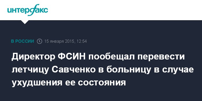 Он отметил, что Савченко употребляет только воду и с ее согласия ей вводится глюкоза. "Никаких претензий к нашим сотрудникам по условиям содержания у нее нет", - сказал глава ФСИН.