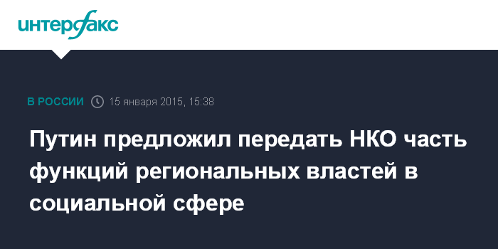 Москва. 15 января. INTERFAX.RU - Президент России Владимир Путин считает, что часть социальных функций региональные власти могут передать в сферу деятельности неправительственных организаций.