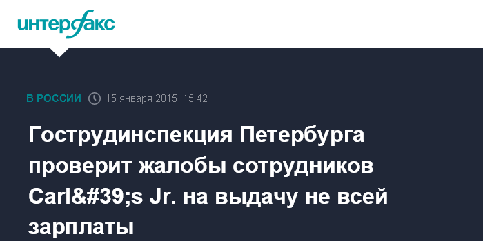 Москва. 15 января. INTERFAX.RU - Федеральная инспекция труда в Санкт-Петербурге начала регистрировать обращения сотрудников сети фастфуда Carl's Jr. на неправомерные действия работодателя, сообщили "Интерфаксу" в пресс-службе ведомства в четверг.
