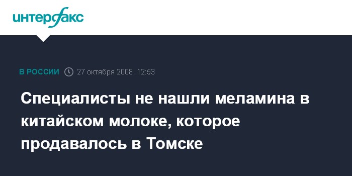 Москва. 27 октября. INTERFAX.RU – В продукции китайского производства "Золотое молоко", реализуемом в Томске, меламин не обнаружен.