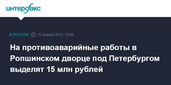 Москва. 15 января. INTERFAX.RU - Минкультуры РФ выделит 15 млн рублей на первоочередные противоаварийные работы в бывшей императорской резиденции - дворце в Ропше под Петербургом, где несколько дней назад обрушились фронтон и колонны. Об этом сообщила пресс-служба министерства.