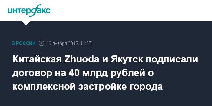 Москва. 16 января. INTERFAX.RU - Китайская инвесткомпания Zhuoda и администрация Якутска подписали договор на сумму 40 млрд рублей о комплексной застройке трех кварталов в Якутске.