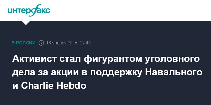 Москва. 16 января. INTERFAX.RU - В отношении активиста Владимира Ионова возбудили уголовное дело за участие в двух акциях: 10 января в поддержку французского издания Charlie Hebdo и 15 января - в поддержку Алексея Навального. Об этом сообщил его адвокат Сергей Панченко.