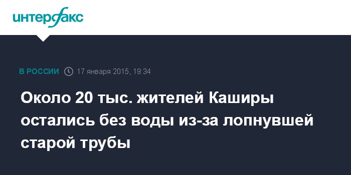 Москва. 17 января. INTERFAX.RU - В подмосковной Кашире около 20 тыс. человек остались без холодной воды из-за прорыва трубопровода, сообщается в субботу на сайте ГУ МЧС по Московской области.
