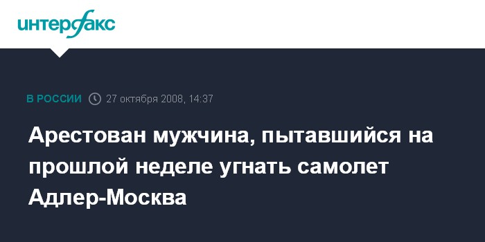 Москва. 27 октября. INTERFAX.RU – Несостоявшийся угонщик самолета, следовавшего в минувшую пятницу из Адлера в Москву, с санкции суда взят под стражу.