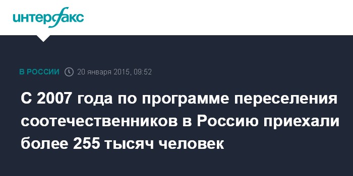 Москва. 20 января. INTERFAX.RU - Более 255 тысяч человек переехали в Россию в рамках госпрограммы переселения соотечественников из-за рубежа, которая стартовала в 2007 года. Как особо отметили в пресс-службе ФМС, прирост за последний год связан с потоком беженцев с юго-востока Украины.
