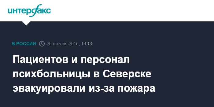 Москва. 20 января. INTERFAX.RU - Возгорание произошло в психиатрической больнице города Северск Томской области, сообщает пресс-служба УМВД по региону во вторник. Из здания были эвакуированы 53 пациента и 9 сотрудников учреждения.