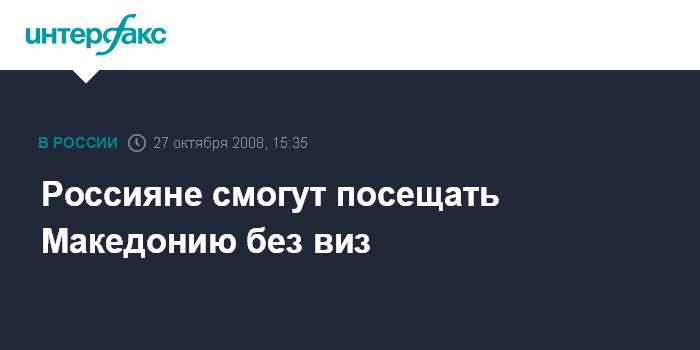 Москва. 27 октября. INTERFAX.RU - Соглашение, по которому граждане РФ смогут посещать без виз Македонию, вступает в силу 31 октября.