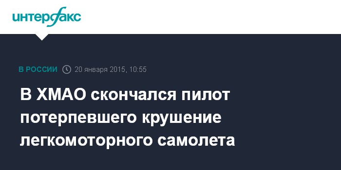 Москва. 20 января. INTERFAX.RU - Пилот легкомоторного самолета Cessna-150, упавшего в воскресенье в Ханты-Мансийском автономном округе, скончался в больнице, сообщили агентству "Интерфакс" в пресс-службе Уральского следственного управления СКР во вторник.