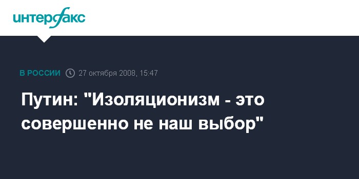 Москва. 27 октября. INTERFAX.RU - Премьер-министр РФ Владимир Путин заявляет, что изоляционистская политика на фоне мирового финансового кризиса - это не выбор России.