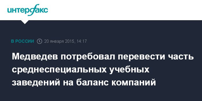 Москва. 20 января. INTERFAX.RU - Глава российского правительства Дмитрий Медведев считает, что некоторые среднеспециальные учебные учреждения должны принадлежать компаниям и ими финансироваться.