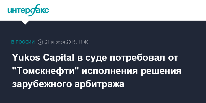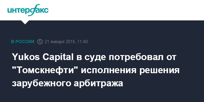 Ранее СМИ сообщали, что в ноябре 2014 года Верховный суд Франции удовлетворил кассационную жалобу и принял арбитражное решение на сумму более чем 7 млрд рублей, причитающихся с "Томскнефти" в пользу Yukos Capital.