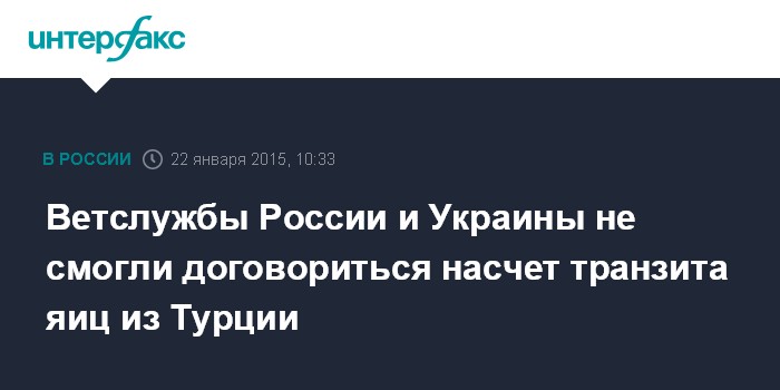 Москва. 22 января. INTERFAX.RU - Россельхознадзору и госветслужбе Украины не удалось решить проблему, возникшую в связи с тем, что Украина запретила транзит в РФ инкубационных яиц из Турции.