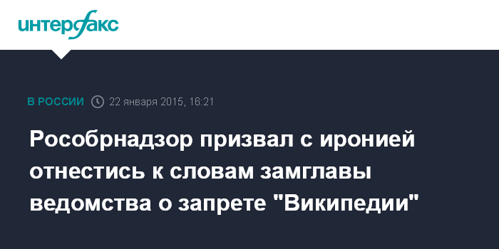 Москва. 22 января. INTERFAX.RU - В Рособрнадзоре заявили, что высказывание замглавы ведомства Александра Бисерова о запрете в России интернет-энциклопедии "Википедия" стоит воспринимать с чувством юмора и здравым смыслом.