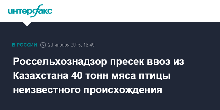 Москва. 23 января. INTERFAX.RU - Россельхознадзор пресек ввоз из Казахстана 40 тонн мяса птицы неизвестного происхождения.